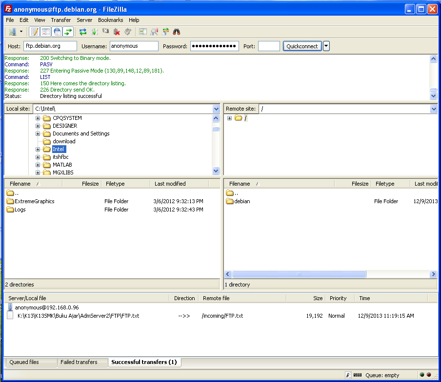 Jika berhasil login dengan benar user diberi akses untuk masuk ke Server FTP, maka user/klien dapat men-mengunduh, mengunggah, mengganti nama file, menghapus file, dll sesuai dengan ijin/permission yang diberikan oleh FTP server.