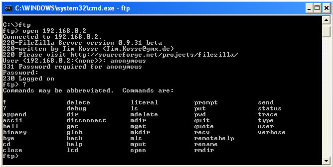 Jika berhasil maka server akan menjawab 230 Logged on lalu muncul prompt ftp> berarti saat itu kita sudah terkoneksi dengan Server FTP 192.168.0.2. Selanjutnya kita bisa melakukan aplikasi kirim terima file. Langkah memulai aplikasi FTP klien pada DOS sama dengan yang dapat dilakukan pada terminal UNIX/Linux.