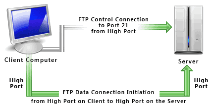 Seperti halnya sebagian besar hubungan klien-server lainnya, mesin klien membuka koneksi ke server pada port tertentu dan server kemudian merespon klien pada port tersebut. Ketika sebuah klien FTP terhubung maka server FTP membuka koneksi ke port kontrol FTP 21.