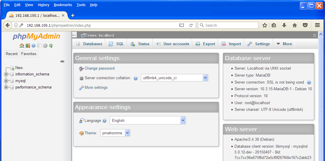 login as: root root@192.168.100.1's password: Linux ns100 4.19.0-17-amd64 #1 SMP Debian 4.19.194-3 (2022-01-12) x86_64 The programs included with the Debian GNU/Linux system are free software; the exact distribution terms for each program are described in the individual files in /usr/share/doc/*/copyright.Instal paket Database server