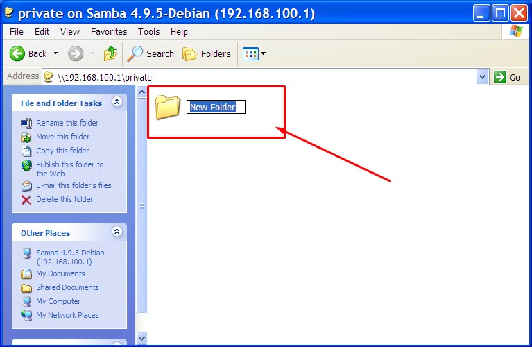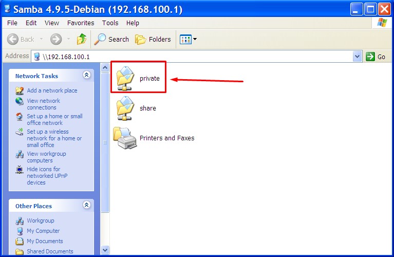 root@ns100:~# mkdir /home/private root@ns100:~# useradd smk root@ns100:~# smbpasswd -a smk New SMB password: 123 Retype new SMB password: 123 Added user smk. root@ns100:~# chown -R smk:smk /home/private root@ns100:~# chmod -R 775 /home/private
