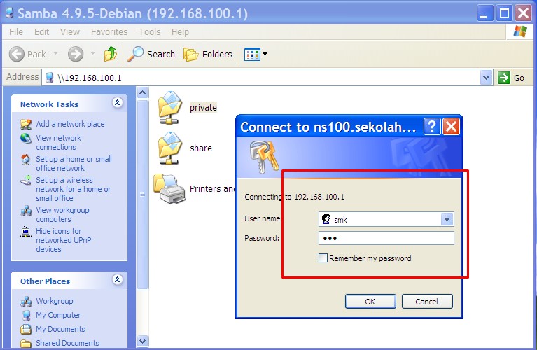 Gambar. Jendela Network Folder Samba ServerKetikan pada kolom User name : smk dan Password : 123 lalu klik OK