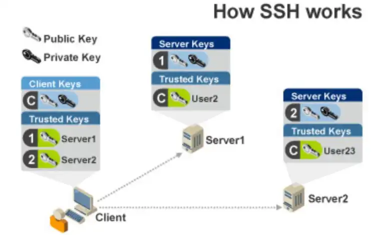 SSH menggunakan metode public-key cryptography untuk mengenskripsi komunikasi antara dua host, demikian pula untuk autentikasi pemakai.