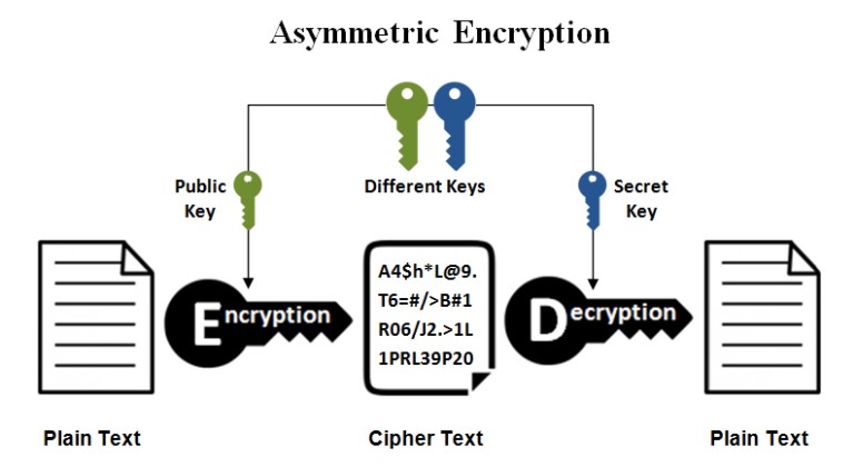 Dengan metode ini, kita akan memerlukan 2 buah kunci berbeda yang digunakan baik untuk melakukan enkripsi dan dekripsi. Dua buah kunci tersebut masing-masing disebut public key (dipublikasikan ke public/ orang lain) dan private key (dirahasiakan/ hanya pemiliknya yang tahu). Masing-masing kunci di atas dapat digunakan untuk melakukan enkripsi dan dekripsi.