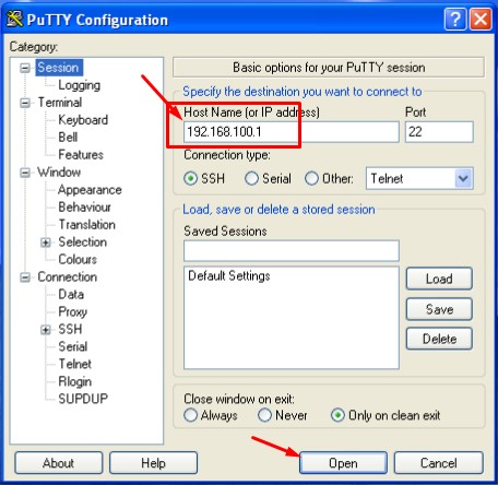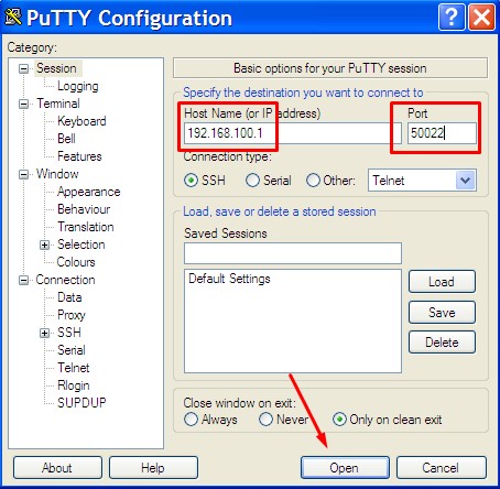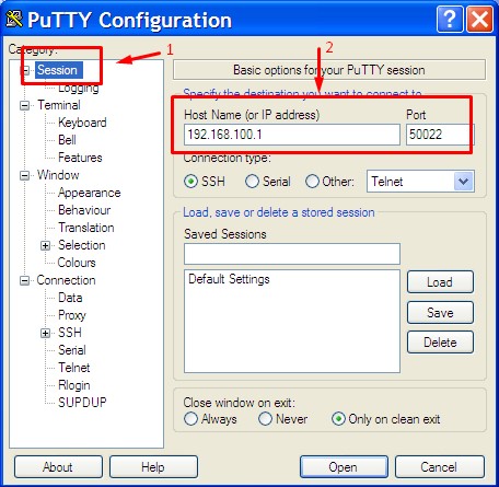 Buka PuTTY – Klik Category Session – Masukan IP Address Server – Masukan Port SSH
