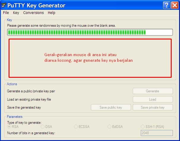 Gambar.2 Proses generate SSH key menggunakan aplikasi PuTTYgenPada tahap ini silahkan gerakkan kursor mouse ke area kosong di bawah progress bar sampai progress bar penuh.
