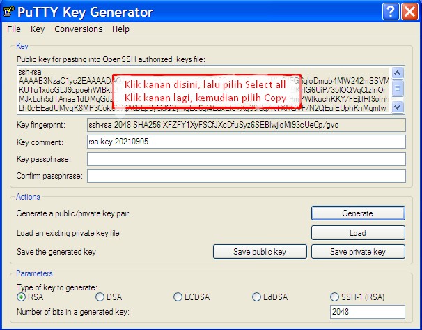 Gambar.10 Proses generate SSH key menggunakan aplikasi PuTTYgenKlik kanan – Paste