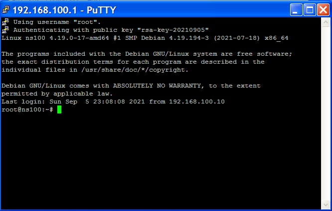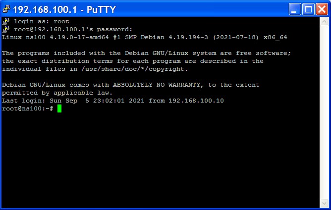 login as: root root@192.168.100.1's password: Linux ns100 4.19.0-17-amd64 #1 SMP Debian 4.19.194-3 (2021-09-05) x86_64 The programs included with the Debian GNU/Linux system are free software; the exact distribution terms for each program are described in the individual files in /usr/share/doc/*/copyright.Instal paket openssh