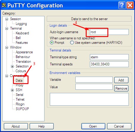 Gambar. aplikasi PuTTYKlik Category Data – pada kotak Auto-login username isikan root (user root)