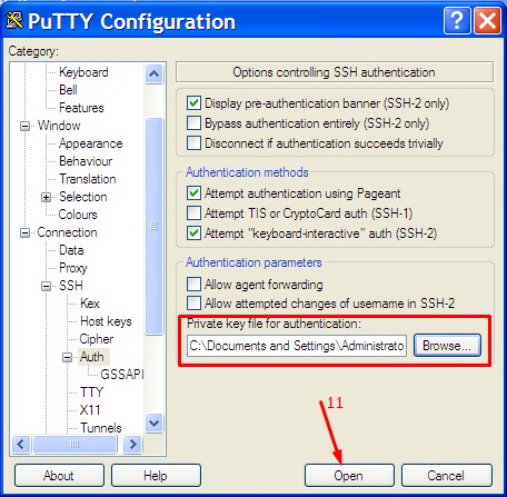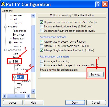 Gambar. aplikasi PuTTYKlik Category SSH – Auth – lalu klik tombolBrowse untuk mencari letak file Private key (Private-key.ppk)