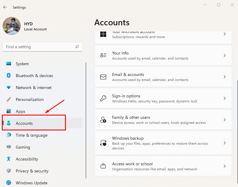 Langkah 2. Pada halaman Pengaturan, klik ‘Accounts‘. Opsi Akun terletak di panel kiri layar.