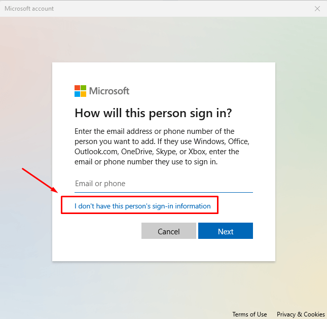 Langkah 5. Klik pada ‘I don’t have this person’s sign-in information’.